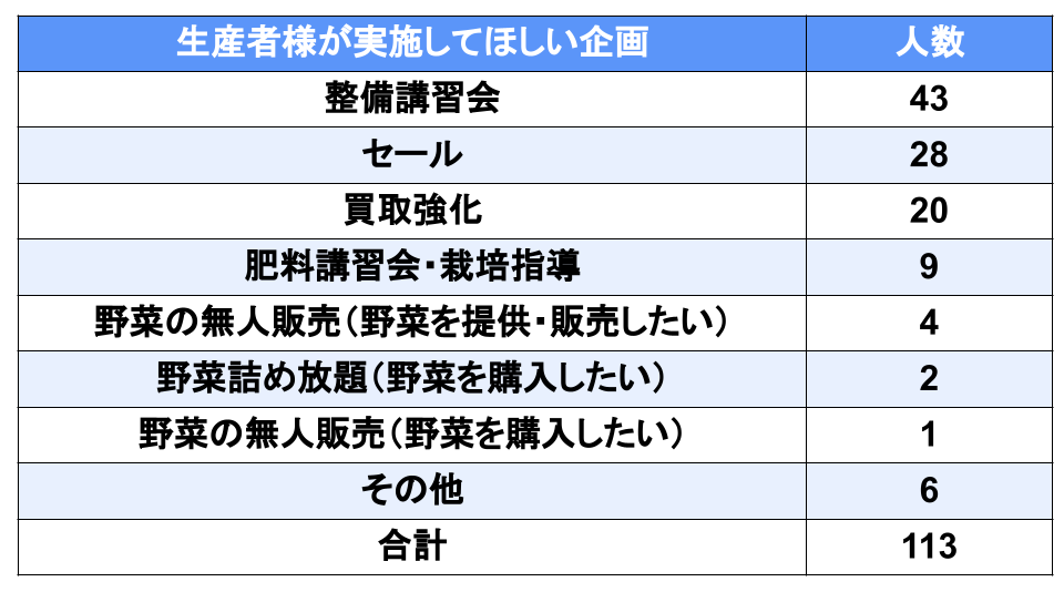 今回のアンケートで農業機械に関する企画を実施してほしいという声が全体の80%以上を占めており、やはり生産者様は農機具王に農業機械に関する企画の実施を期待していることが改めてわかりました。中でも最も回答の多かった「整備講習会」では日々の機械のメンテナンスや部品の交換方法など普段機会を触る機会が少ない生産者様でも取り組みやすい整備を教えてほしいという声が多くありました。農機具王は農業機械専門の整備士が在籍している店舗もあるため、こういった企画の実施を検討してまいります。さらにセールや買取強化についてもお客様に満足いただけるようにイベントを企画していきます。