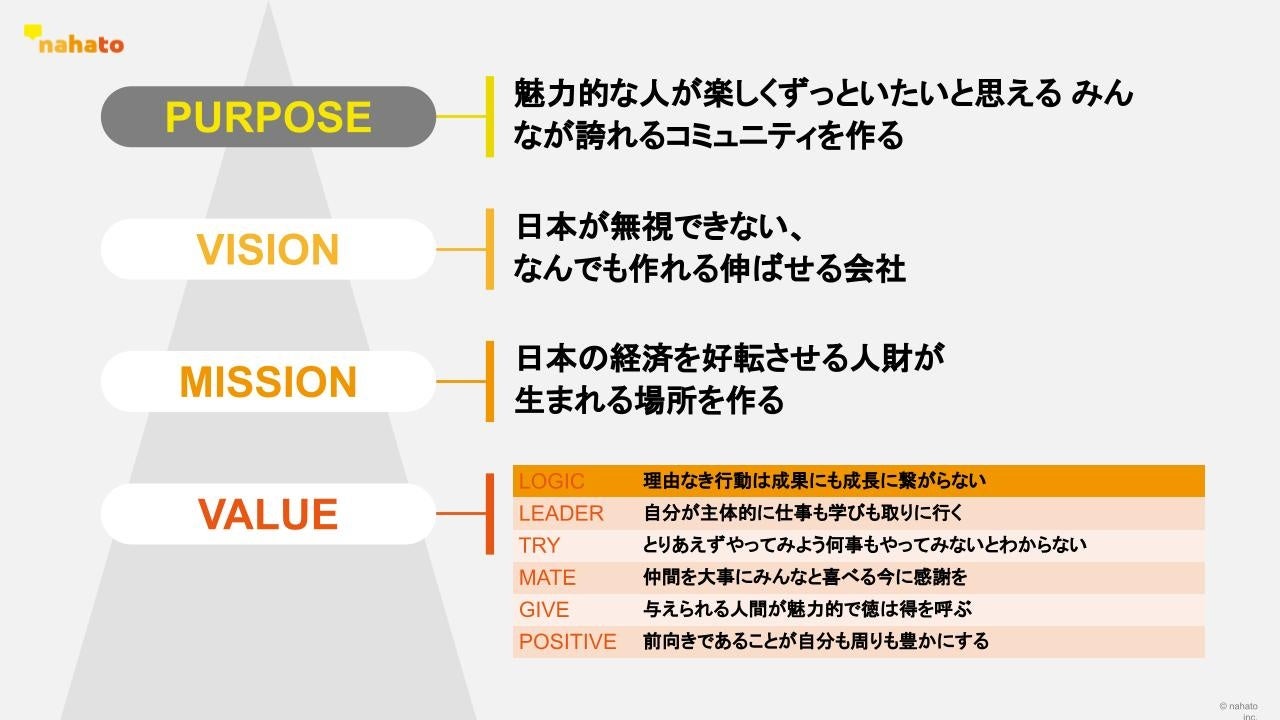 また、多くの企業ではPURPOSEの次にMISSIONが重要と捉える「PMVV」を掲げていますが、ナハトはPURPOSEの次にVISIONを置いて「PVMV」としています。