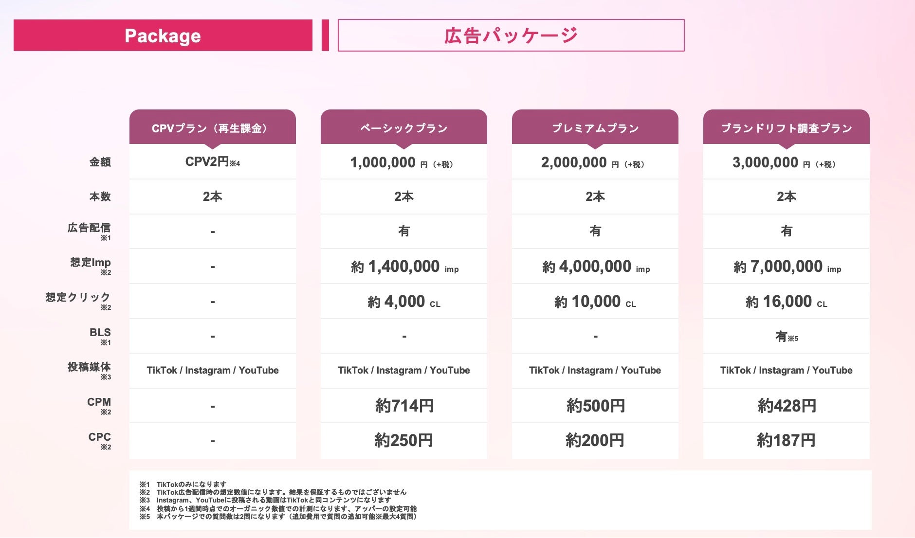 動画の投稿と広告配信に加え、TikTokのブランドリフト調査(BLS)を行うことができ、広告やキャンペーンへの反応に関するインサイトを得ることができる、アンケートベースのソリューションとなっており、キャンペーンの効果測定に最適なプランになっています。