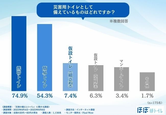 「災害用トイレとして備えているものはどれですか?」と聞いたところ、最も多かったのは『携帯トイレ(74.9%)』でした。