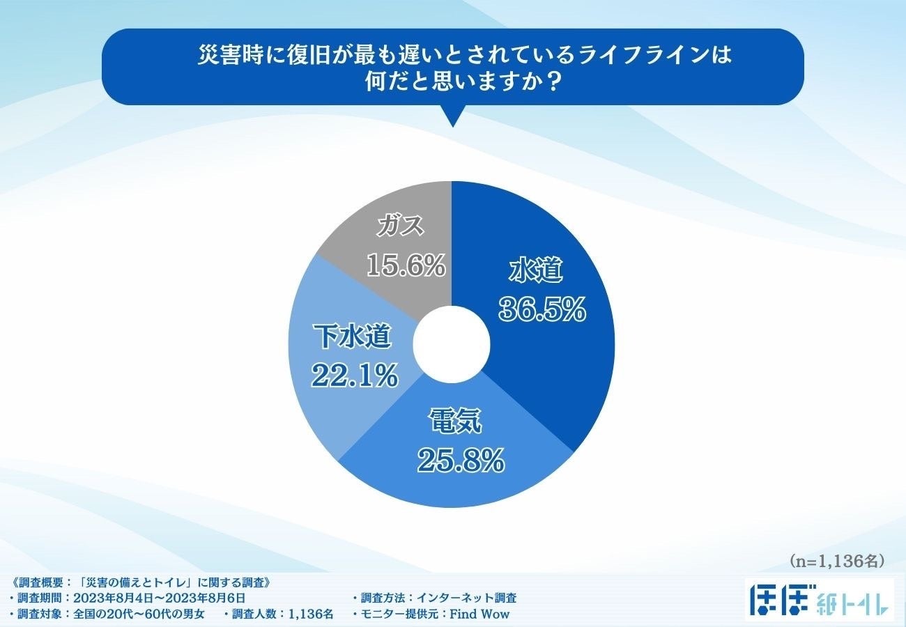 そこで、「災害時に復旧が最も遅いとされているライフラインは何だと思いますか?」と聞いたところ『水道(36.5%)』が3人に1人以上で最も多く、それ以降は『電気(25.8%)』『下水道(22.1%)』『ガス(15.6%)』と続きました。