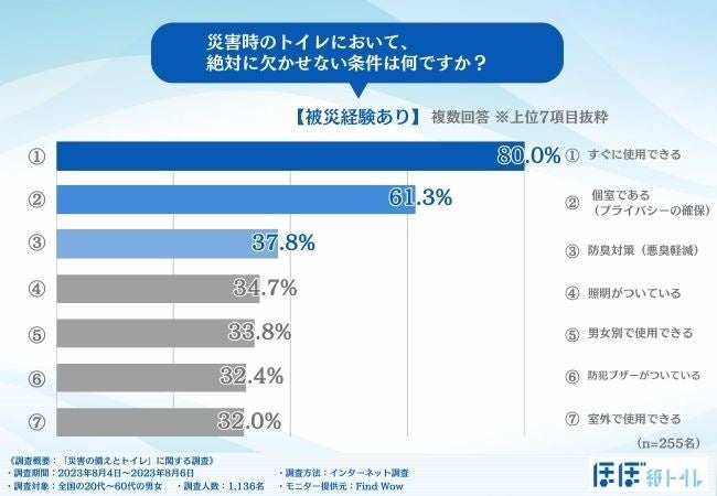 最後に被災経験のある人たちに、「災害時のトイレにおいて、絶対に欠かせない条件は何ですか?(あてはまるものすべて)」と聞きました。