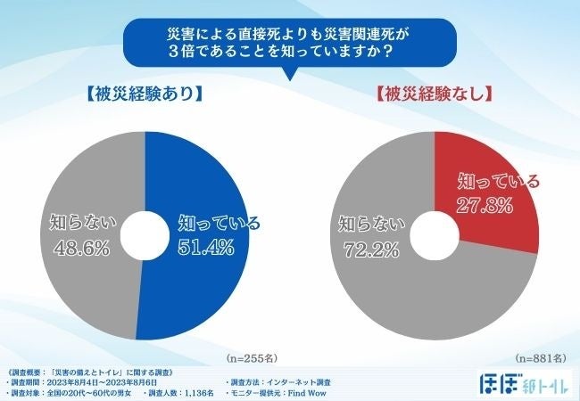 被災経験がない人は『知らない(72.2%)』と約4人に3人が災害関連死に対しての脅威を認識していない人がいることが分かりました。