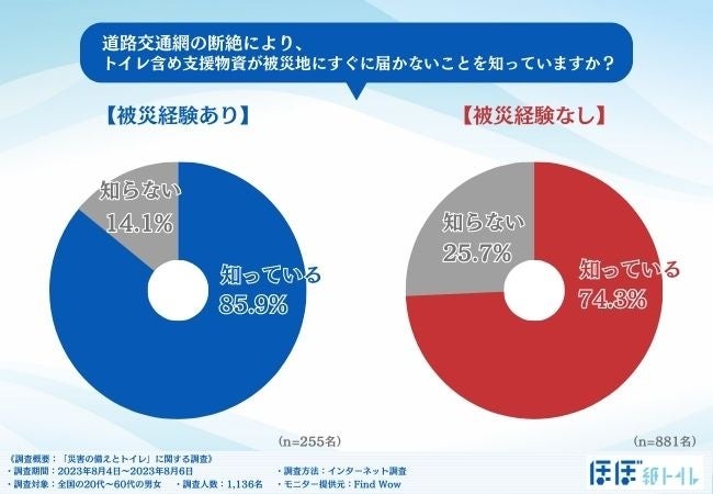 また、被災経験のない人も『知っている(74.3%)』『知らない(25.7%)』と、物資がすぐに現地に届かないことを知っている人が多い結果となりました。