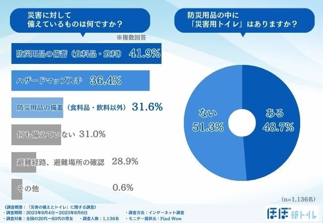 そこで今回、備蓄型組立個室トイレ『ほぼ紙トイレ』(https://www.kawahara-giken.com/products/paper-toilet/)を製造・販売する株式会社カワハラ技研は、全国の20代~60代の男女1,000名を対象に「災害の備えとトイレ」に関する調査を実施しました。