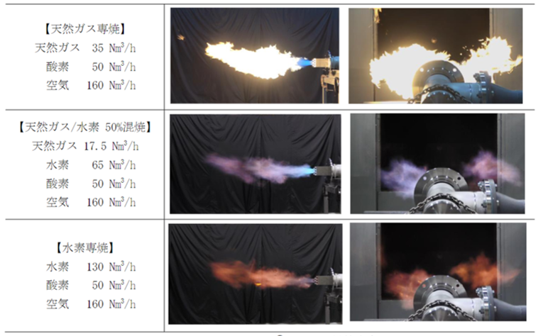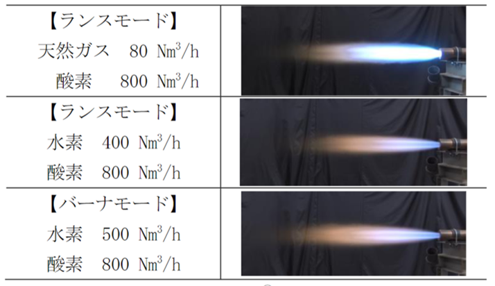 SCOPE-JETⓇの水素燃焼化では、火炎温度が高く燃焼速度も速くなるためバーナ近傍が高温になり、バーナへの熱負荷軽減対策が課題でしたが、独自のノズル構造を適用することにより安定した燃焼を達成するとともに、天然ガスを燃料とした場合と同等の噴流特性を達成しました。