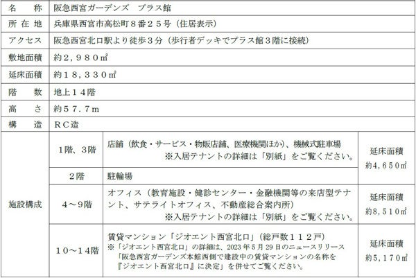 2008年にオープンした本館の15周年に合わせて開業する「プラス館」は、西宮北口駅南東エリアの大規模開発の集大成として取り組んでおり、賑わいの向上や生活利便機能の充実を図ることはもとより、住環境の魅力向上にも努めています。具体的な施設構成は表のとおりです。