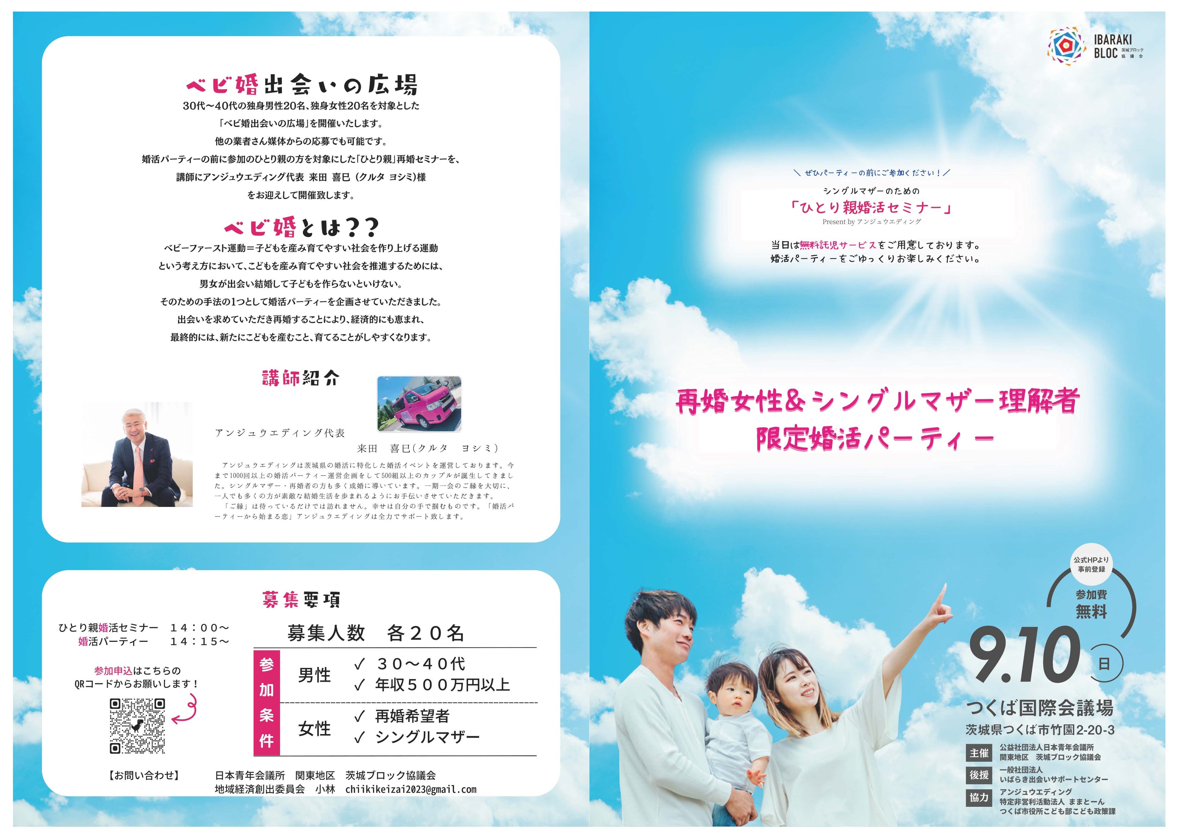 この度、公益社団法人日本青年会議所関東地区茨城ブロック協議会地域経済創出委員会では「ベビーファースト~始まりは出逢いから~」を開催いたします。 婚姻件数の減少や出生率の低下が問題視されており、内閣府調査では子どもを産み育てに くいと考えている国民が 6 割を超えているという結果があります。 そのような背景の中、結婚や子育てに前向きになっていただくことを目的として 「婚活パーティー」「お子様向けワークショップ」を開催させていただきます。 また、茨城県やつくば市で展開されている子育て支援やひとり親の世帯への支援の紹介、そして取り組みを説明をしてくれるブースの設営をします。同会場において子育て支援ブースもご用意しております。お気軽に足をお運びいただき、お立ち寄り下さいますようお願い申し上げます。