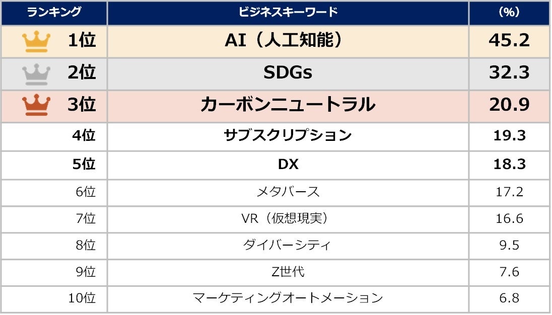 - 注目度が最も高かったのは「AI(人工知能)」(45.2%)となった。 続いて「SDGs」(32.3%)、「カーボンニュートラル」(20.9%)のサステナブル関連のキーワードが並んだ。また、4位、5位は「サブスクリプション」(19.3%)「DX」(18.3%)となり、デジタルを通じたビジネス変革に関する興味を窺える結果となった。【図表1】