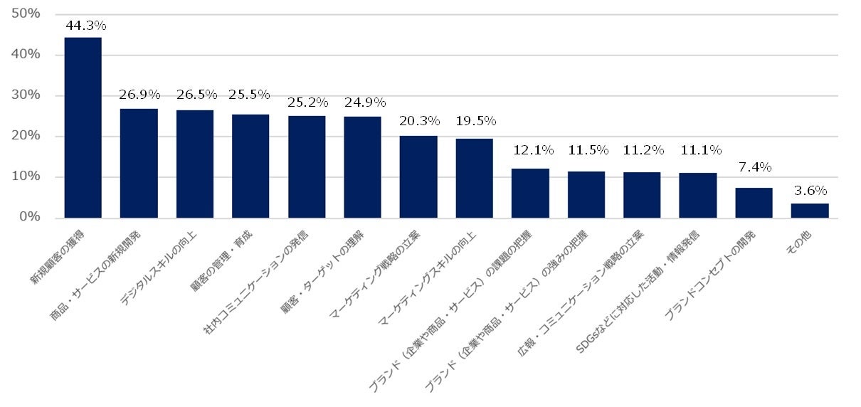 - 業務推進上でのマーケティング課題(全体)トップは「新規顧客の開拓」(44.3%)。次に「商品・サービスの新規開発」(26.9%)、「デジタルスキルの向上」(26.5%)という結果となった。【図表4】