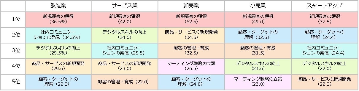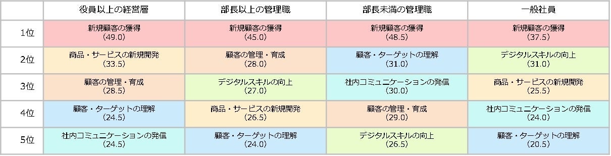 - 2位~5位のマーケティング課題の項目は、「商品・サービスの新規開発」「顧客の管理・育成」「顧客・ターゲットの理解」「社内コミュニケーションの発信」「デジタルスキル向上」となっており、順位は異なるものの、役職者別でも同様の傾向となった。
