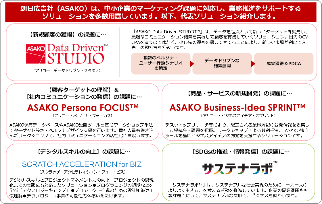 ASAKO戦略ビジネスチームは、それぞれ専門分野をもつ多様なメンバーで構成。従来の広告会社の枠を超え、新しい課題、埋もれていた課題を見出し、新たなビジネス成長のきっかけをつくり、経済価値と社会価値の両立を目指します。特に、中小企業やスタートアップ、新規事業の成長のためには、マーケティング支援から事業開発・成長まで最良のパートナーとして並走します。
