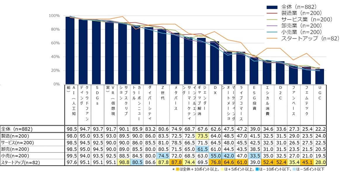 - 続いて、認知状況を業種別で見てみると『スタートアップ』においては、全体と比較し「メタバース」「DX」「マーケティングオートメーション」「ライブコマース」等のデジタル関連のキーワードで10pt以上の差をつけて認知度が高い結果となっている。【図表2】