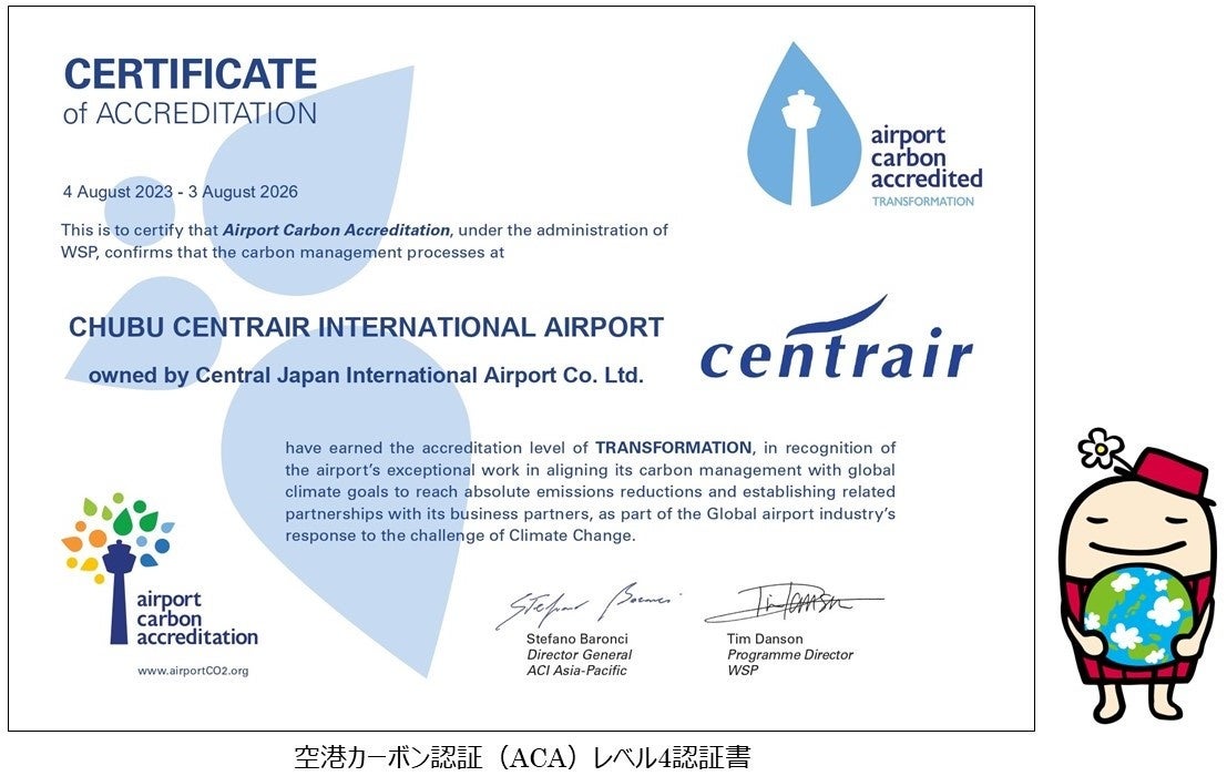 今回の認証を受け、空港関係事業者から構成される中部国際空港脱炭素化推進協議会を中心に、引き続き、ACAプログラムを活用し、ゼロカーボン達成に向け、温室効果ガスの削減に取り組んでまいります。