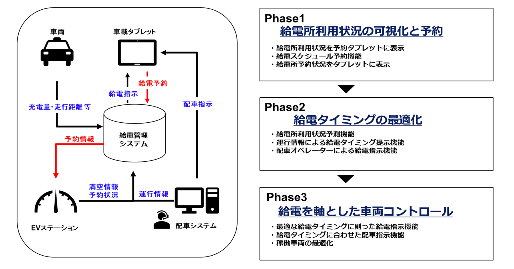 ① 配車システムと連携した給電管理システムを構築し、BEV運用上の給電最適タイミングを実証