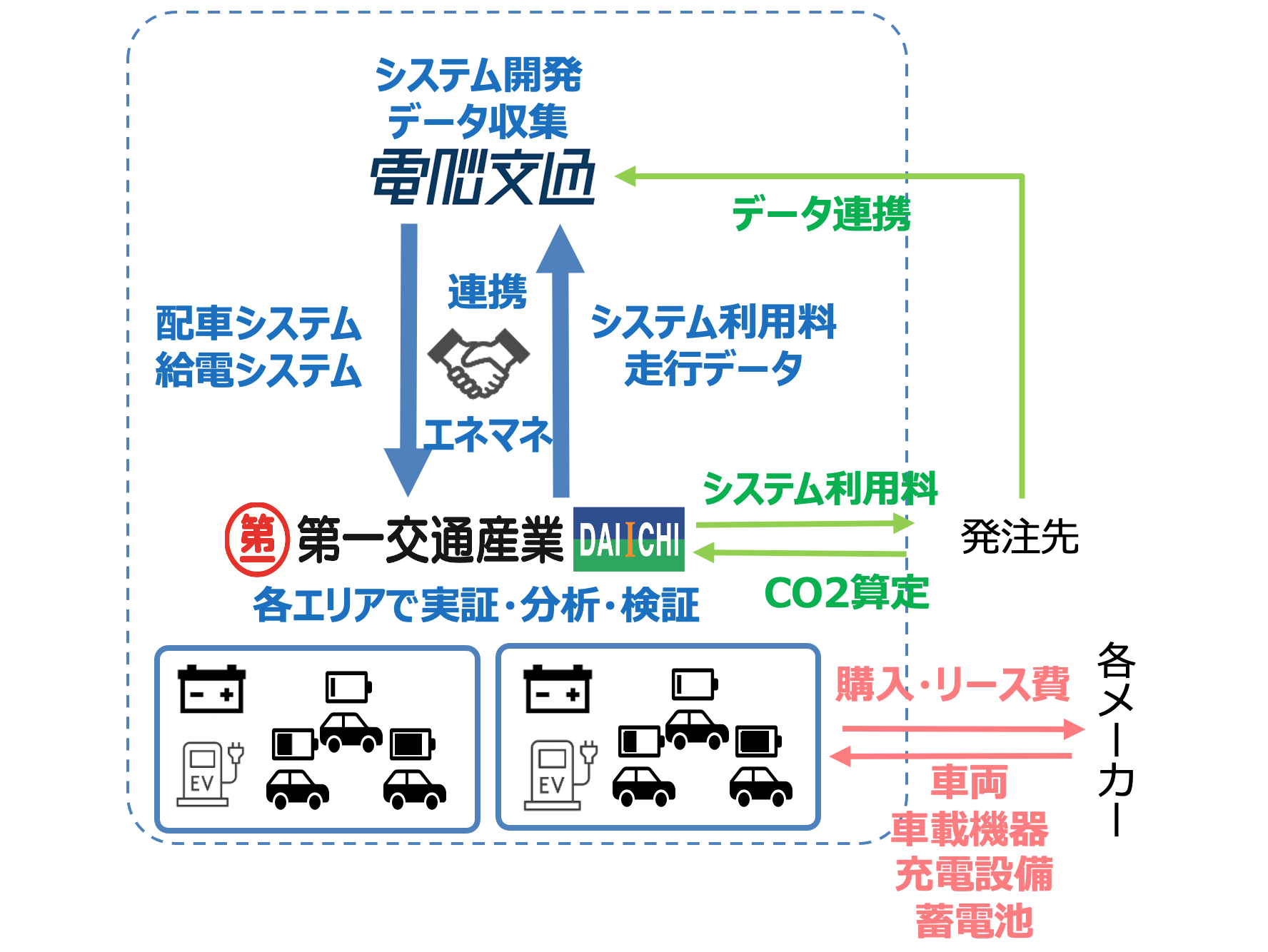 このたび採択された本事業は、第一交通と電脳交通が連携し、広島県および和歌山県で各エリアの特性に合わせ、配車システムをコアとした運行の効率化と給電タイミングの最適化を行います。電動車の商用利用は、主に航続距離の不足と給電時間の長さといった課題により導入・利用が進んでおりません。これらの課題を解決すべく、システム構築とデータを基に最適な車両・設備の配置を行い、全体最適化を行います。
