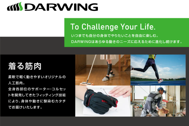 この人工筋肉とサポーターで培った人体のサポートノウハウやフィッティング技術を掛け合わせてアシストスーツブランド、DARWING(ダーウィン)が誕生しました。多くの方が活動的に人生を楽しむために、DARWING(ダーウィン)は進化の歩みを止めません。