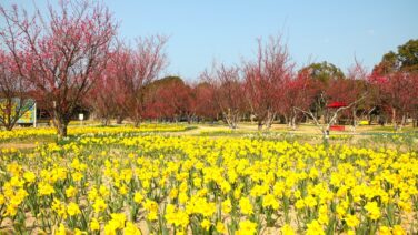 見頃を迎えたセイヨウスイセンとウメ  国営海の中道海浜公園(福岡県福岡市東区)では、セイヨウスイセンとウメが見頃を迎え、早春の花の共演が楽しめます。  黄色いセイヨウスイセンと紅白のウメが、同じ花壇内で咲き誇り、華やかなコントラストを生み...