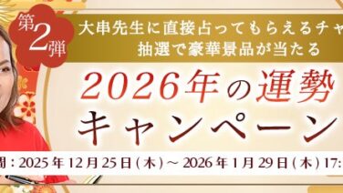 株式会社レンサ(本社:東京都渋谷区、代表取締役:武井哲也)は、2025年12月25日(木)より、運営する公式占いサイト「大串ノリコの占い」にて『2026年の運勢キャンペーン第二弾』の提供を開始いたしました。