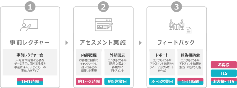 TIS独自のチェックシートに沿ってお客様ご自身で社内向けの人的資本データの把握や活用について棚卸しを実施いただき、チェック結果をご提出いただきます。