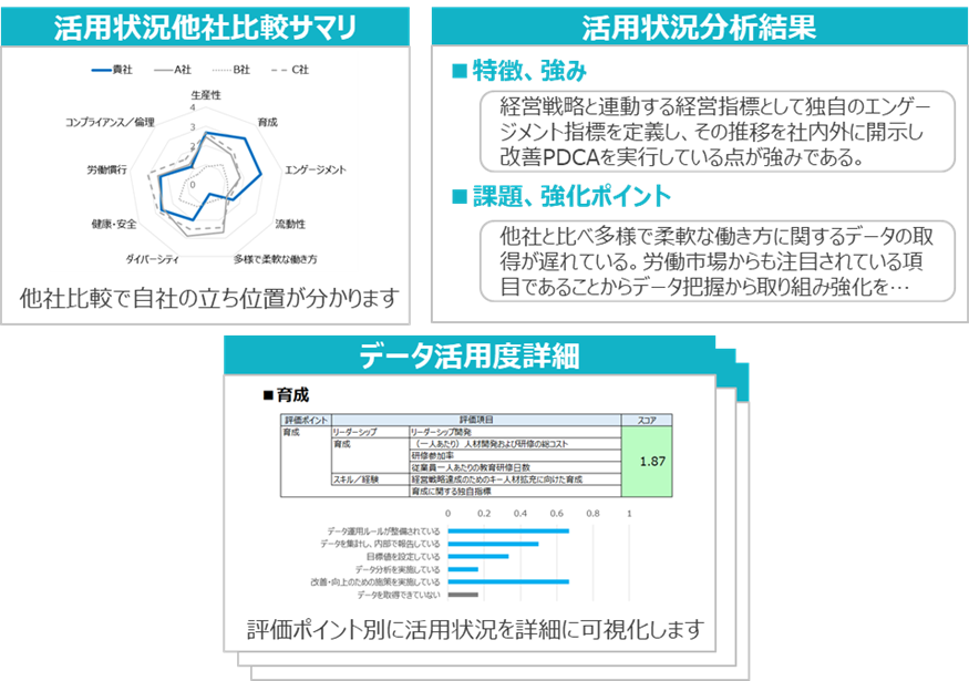 東京大学大学院 経済学研究科 大木清弘准教授監修の下、内閣官房の「人的資本可視化指針」、自社の人的資本の情報を定量化・分析し、開示するための国際的なガイドラインであるISO 30414、TIS独自の非財務分析結果を踏まえて設計したアセスメントツールを利用し、クイックにデータ活用度の棚卸ができます。