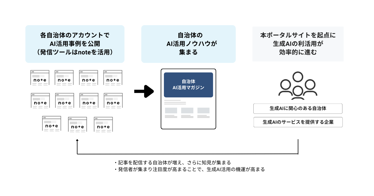 本ポータルの開設は、行政の生成AI活用を促進することを目的に、横須賀市とnote社が連携協定を締結したことで実現しました。横須賀市とnote社を中心に、参加を表明した11自治体で運営を行っていきます。また横須賀市とnote社は本ポータルの運営に限らず、生成AIに関心のある自治体向けイベントなど、活用を後押しするためのさまざまなコンテンツも今後続々と発表していく予定です。