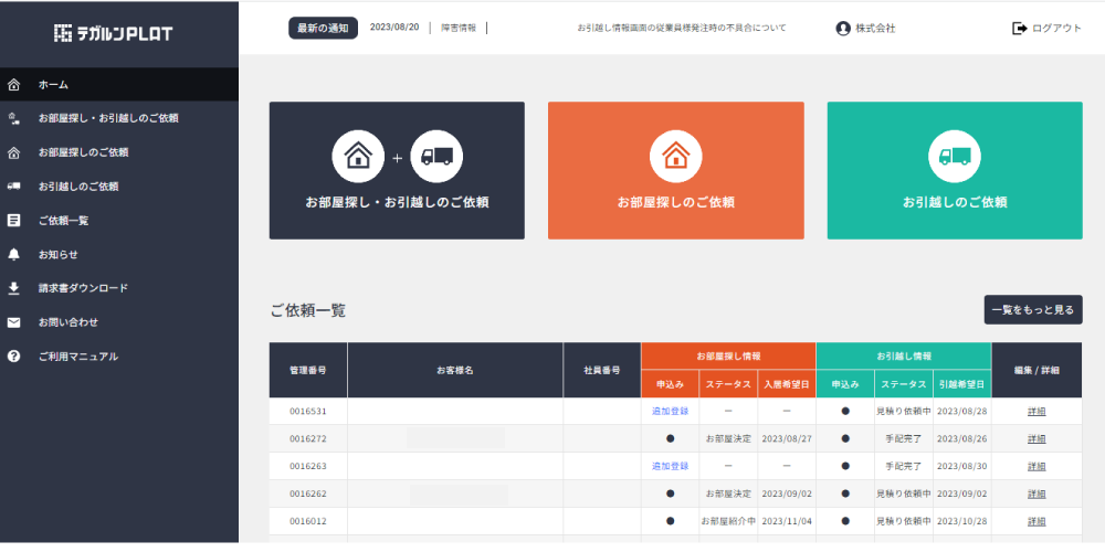 転勤手配サポートシステム「テガルンPLAT」は、全国のお部屋探しやお引越しのお手配、ライフラインのご案内といった企業の従業員様が転勤の際に必要になる新天地でのお手配がワンストップでできるWEBシステムサービスです。お部屋探しやお引越し見積りのご依頼から進捗確認、引越会社の決定、引越代金の請求書確認まで、専用のWEBページ上で管理することが可能です。