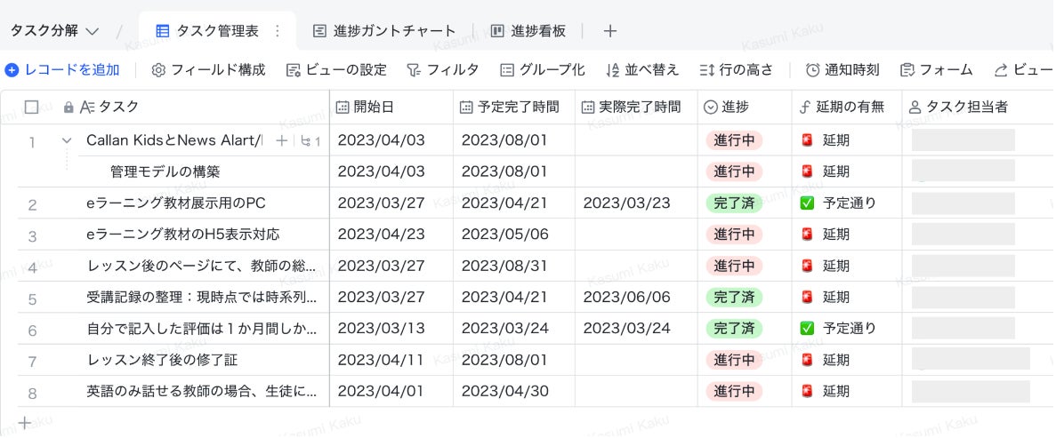 QQEnglish様は、今年の戦略目標の一つとして「ユーザ満足度を全面的に向上させ、プロダクトを磨く」というプロジェクトを推進し、Lark Baseで管理しています。複数の部門を繋ぐ、関連人物が非常に多い全社プロジェクトで、現場社員や各部門スタッフへの意見の収集から、優先付け、タスク振り分け、進捗管理とトラッキングまで、全てをLark Baseで一元管理されています。