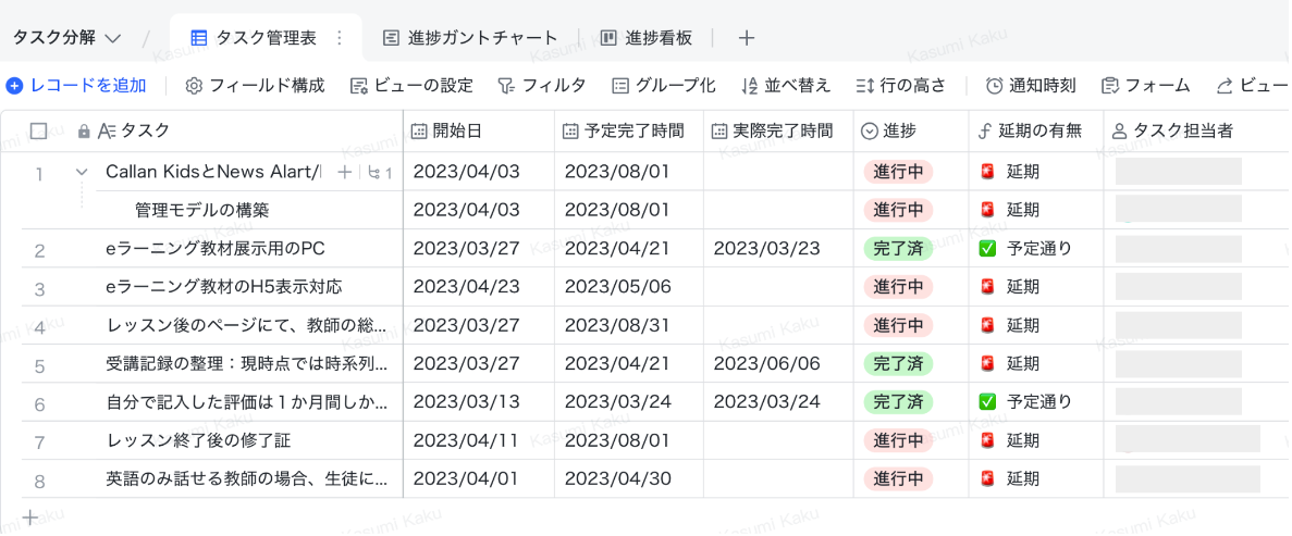 QQEnglish様は、今年の戦略目標の一つとして「ユーザ満足度を全面的に向上させ、プロダクトを磨く」というプロジェクトを推進し、Lark Baseで管理しています。複数の部門を繋ぐ、関連人物が非常に多い全社プロジェクトで、現場社員や各部門スタッフへの意見の収集から、優先付け、タスク振り分け、進捗管理とトラッキングまで、全てをLark Baseで一元管理されています。