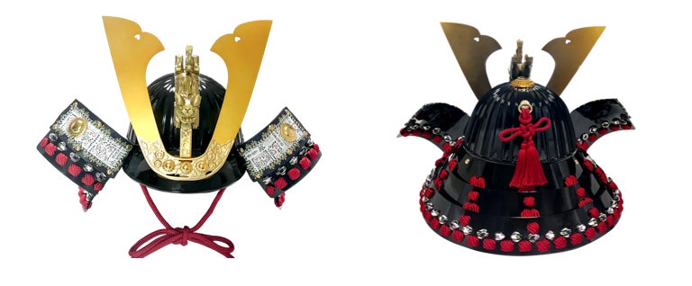 安全性・耐久性・軽量化にこだわりながらも、デザイン面も本格的な室町時代の兜を再現。今話題のメジャーリーグ選手の兜と同じベースのデザインを、子ども向けにアレンジいたしました。正面には、樹脂製で耐久性と軽量化を両立した狛犬がデザインされています。鍬形(くわがた)は安全面を考慮し、樹脂製にして外れないよう固定しています。内側は軽量化のため、ヘルメット内装を採用し取り外しやサイズ調整も可能です。また、取り外して洗えるため衛生面も考慮し設計しています。