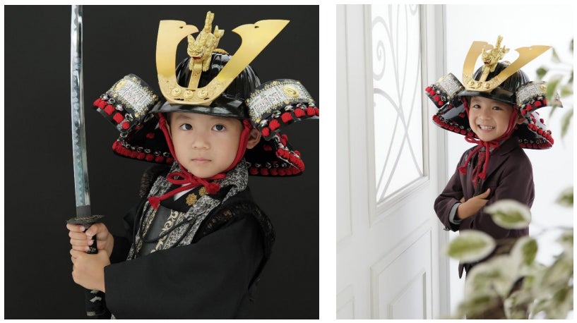 兜は話題の「丸武産業」が制作。特許取得の子ども向け鎧兜【かる冑】の兜をベースにさらなるオリジナル仕様で進化した兜です。武将気分を盛り上げる羽織や、刀などの小物もご用意しています。刀を勇ましく構えて、戦国武将気分を満喫しながら、臨場感あふれる撮影をお楽しみいただけます。和装でも洋装でも撮影できる「かっこいい」「かわいい」の二刀流の撮影ができます。この秋、スタジオアリスでホームラン級の笑顔でハレの日を盛りあげませんか。