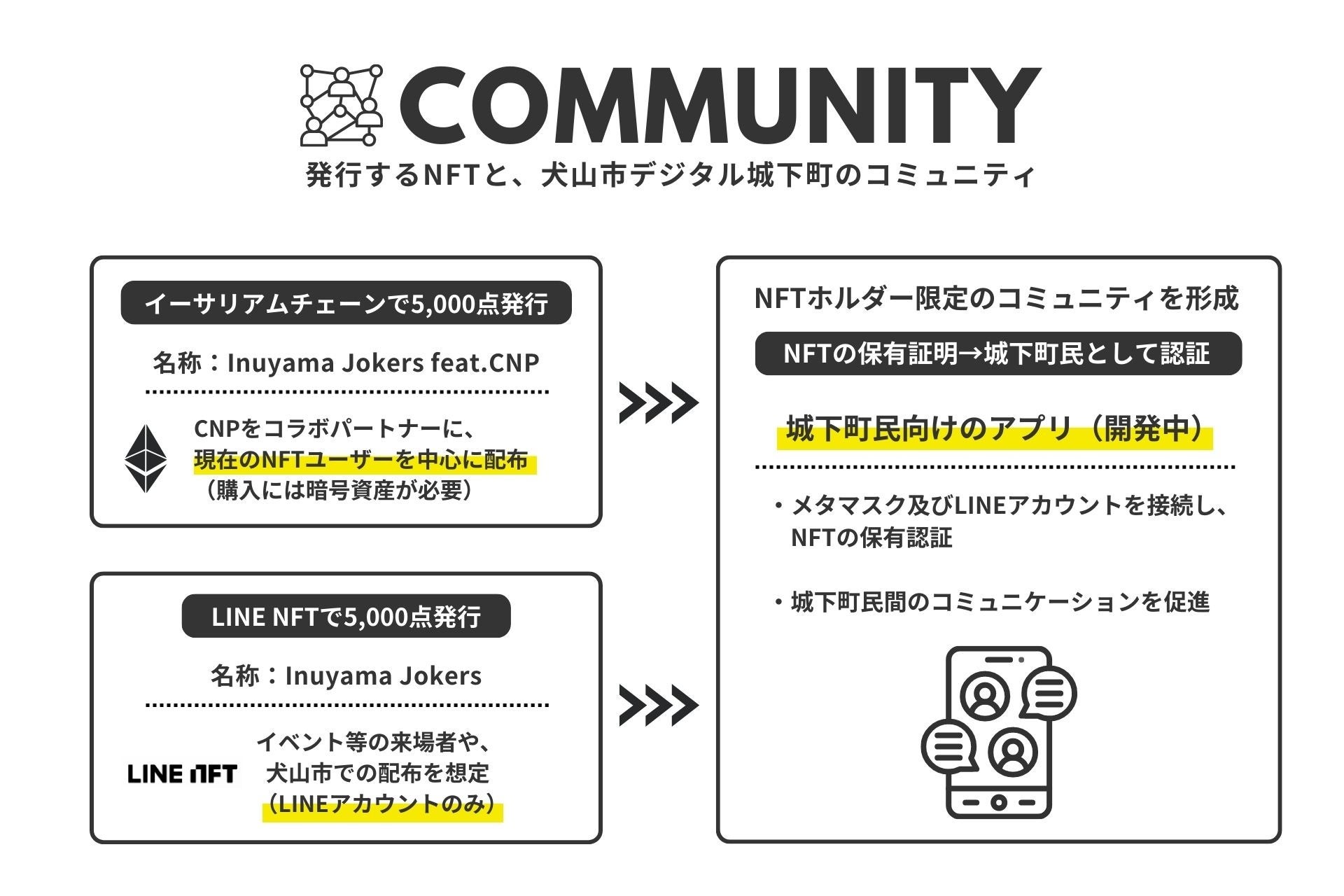 犬山市デジタル城下町プロジェクトは、NFTなどのWeb3技術を活用し、犬山城をはじめとした犬山市の歴史文化・自然・観光資源の「ファン」を増やしていく取り組みです。まず、デジタル城下町民の証となる10,000枚のNFT「Inuyama Jokers」を発行・配布し、デジタル城下町民コミュニティを構築していきます。
