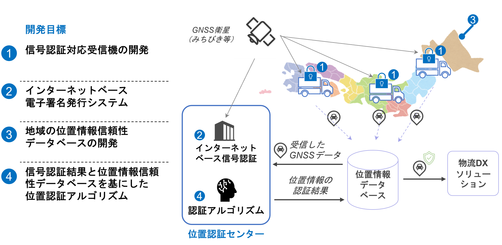 当社の課題は、昨年に引き続き「民間宇宙活動で推進する産業発展及び国際競争力強化に資する技術開発」です。このテーマについてフェーズ 1からフェーズ2*へと位置情報の信頼性をベースとした、 物流事業者向け第三者位置認証サー ビスを開発し、物流事業における様々なDX化アプリケーションへ提供する計画です。