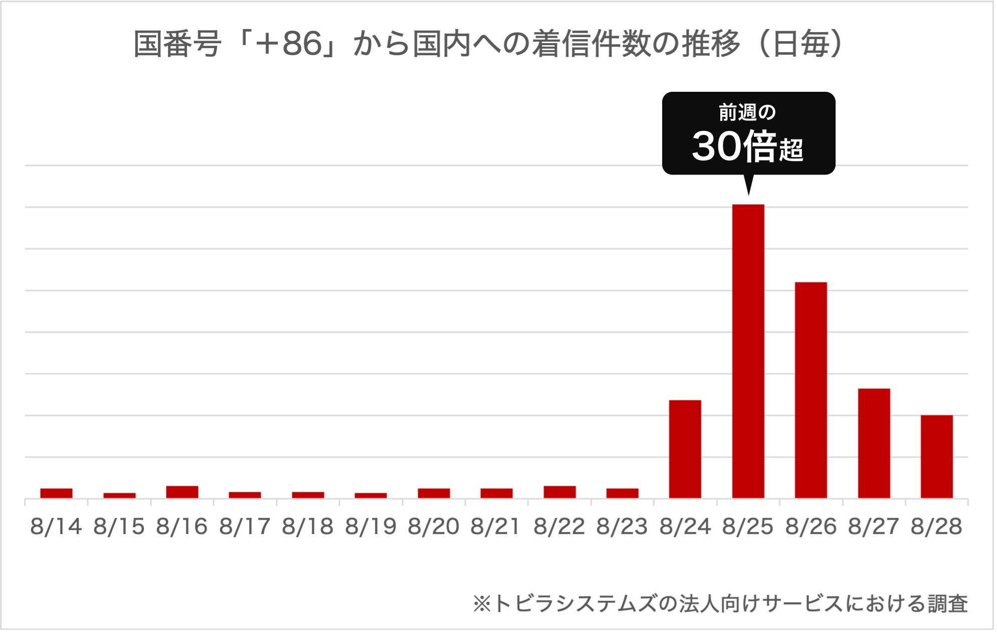 2023年8月24日のALPS処理水の海洋放出開始後、特に報告が増えている国番号「+86(中国)」から国内への電話着信状況について、当社の調査情報は以下となります。