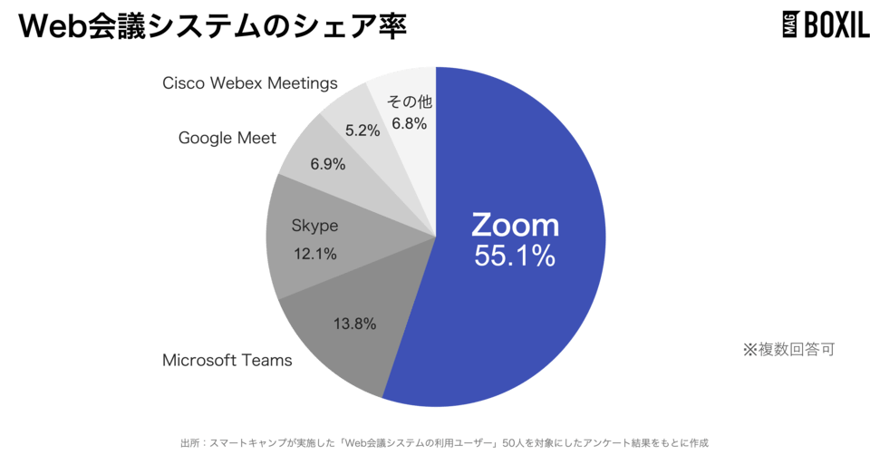 ウェブ会議システムのユーザーを対象としたアンケートによれば、Zoom利用者が55.1%で首位を維持し、Microsoft Teamsが13.8%、Skypeが12.1%、Google Meetが6.9%、そしてCisco Webex Meetingsが5.2%となっており、Webex Meetingsは日本市場において第5位の市場シェアを有しています。※ 1
