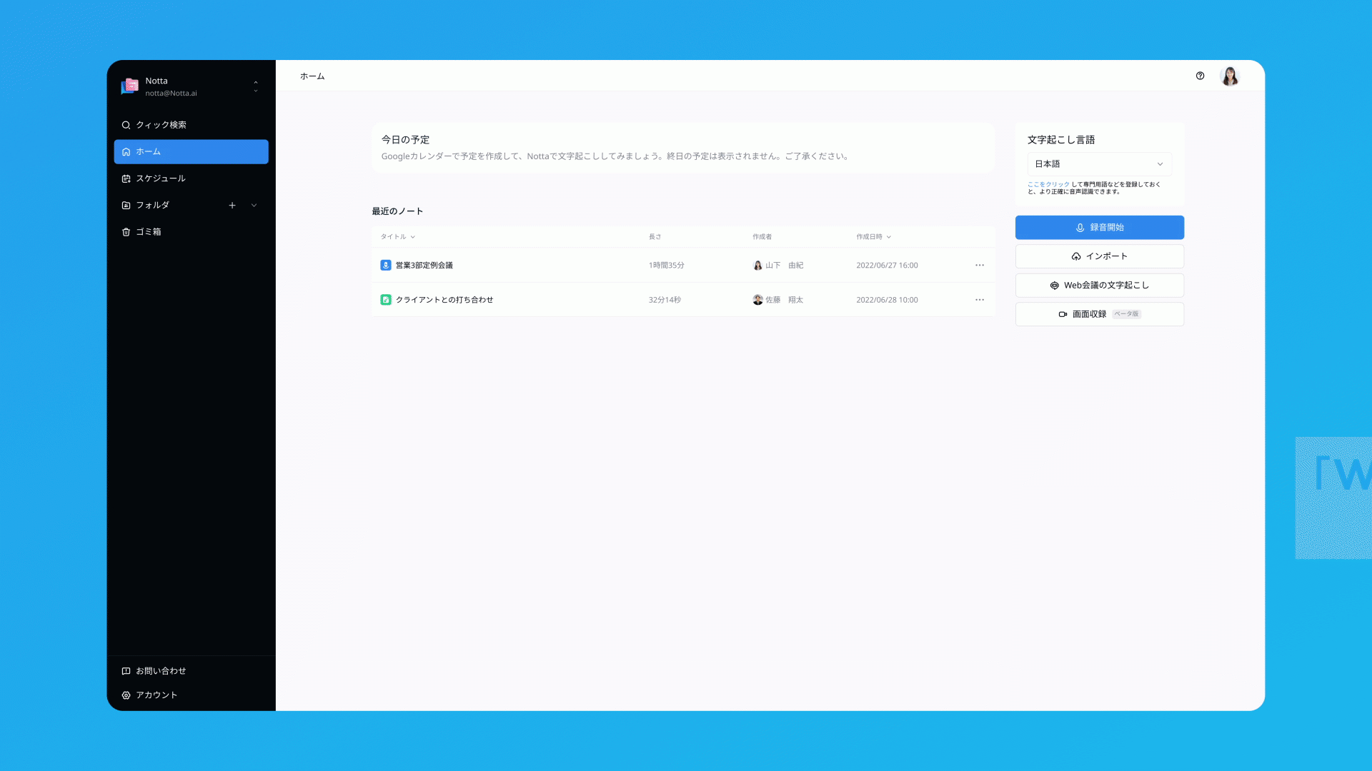 「Notta Bot」を使用した文字起こしは、進行中のWeb会議のみに対応しています。