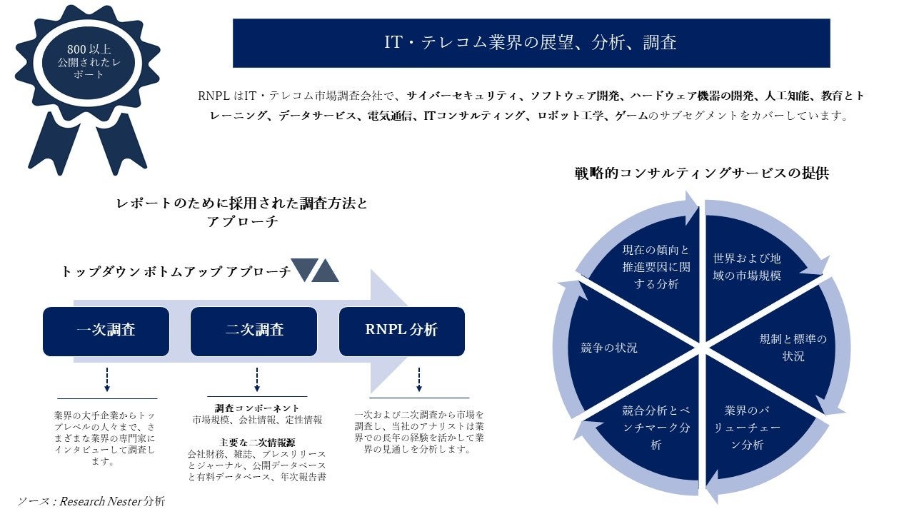 当社 RNPL は、コンサルタント、企業、投資家、または市場がどこに向かっているのかを理解しようとしているすべての人に IT・テレコム業界のインテリジェンスを提供する大手プロバイダーであると宣言することに大きな誇りを持っています。 当社は、すべての重要なパラメーターを組み込んだ最も広範な IT 市場レポートを作成します。 当社は、テクノロジー市場の関係者にアジャイルな洞察を提供する最高の IT 市場調査会社です。 当社にはテクノロジー市場調査の専門チームがあり、カテゴリー固有のテクノロジー市場ソリューションを提供することで、すでにさまざまな企業を支援してきました。 要件に応じて特別に作成されたIT市場調査を提供します。
