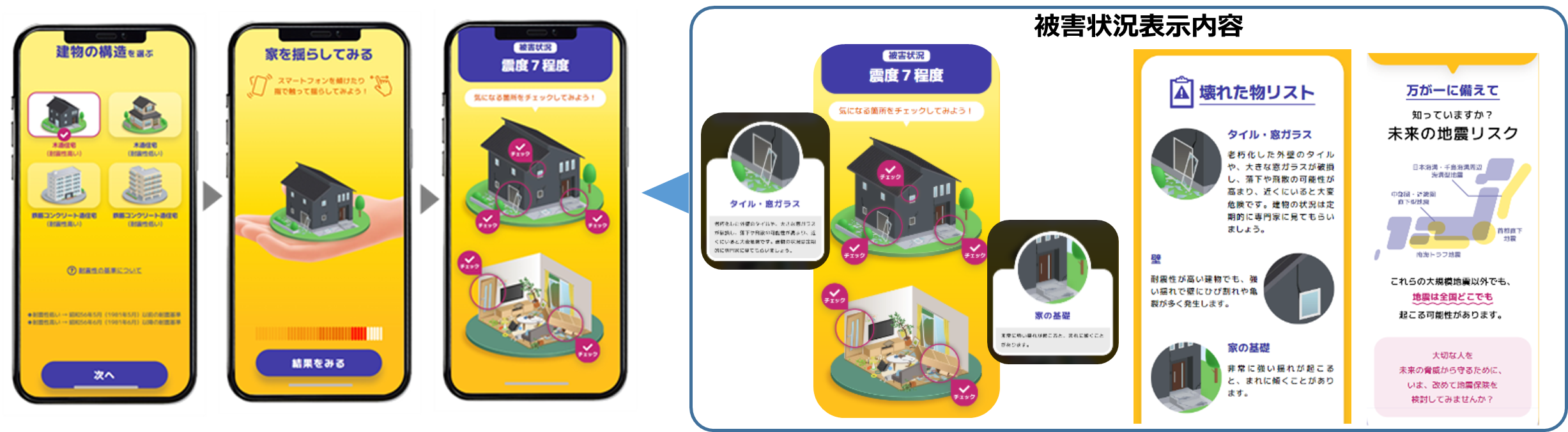 「地震被害チェッカー」では、建物の構造や耐震性をもとに区分した4つのパターンから建物を選択した後、スマートフォンの加速度センサーを活用して実際にスマートフォンを揺らすことで、推定被害がチェックできます。加速度センサーによってスマートフォンの揺れを感知し、画面上に表示された建物が壊れ、「震度5弱~5強」「震度6弱~6強」「震度7」の3段階で、選択した建物の屋外/屋内双方の具体的な被害内容が提示されるため、震災後の住まいの状況をリアルに感じ取ることができます。