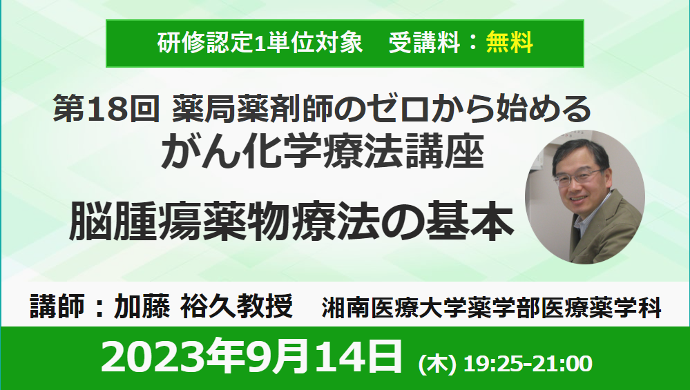 株式会社グッドサイクルシステム(本社:東京都渋谷区、代表取締役社長:遠藤 朝朗)は、薬局経営者・薬剤師向けにオンラインセミナーを無料で開催します。今回は「薬局薬剤師のゼロから始めるがん化学療法講座~脳腫瘍薬物療法の基本」です。
