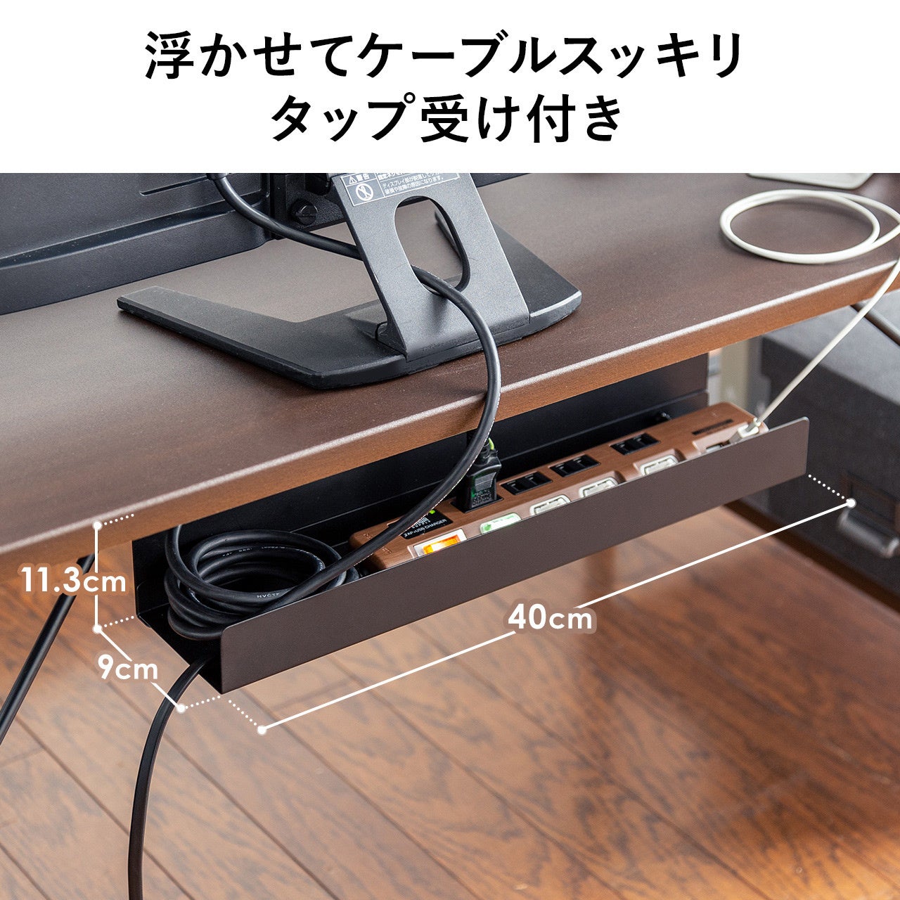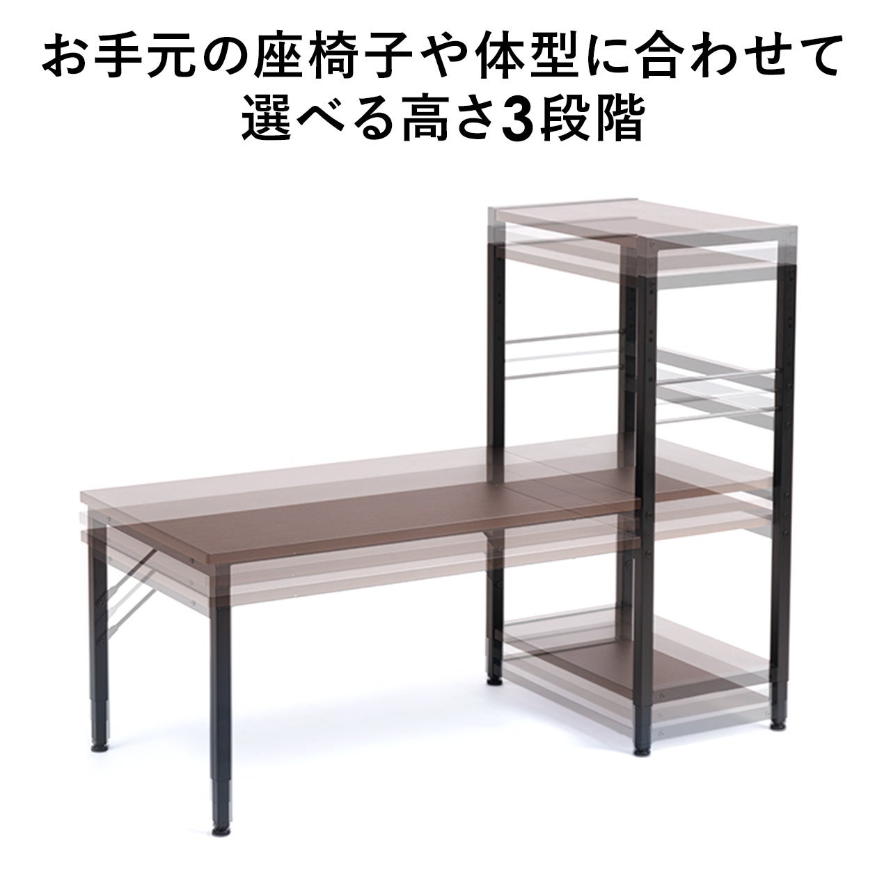 ローデスクとシェルフが一体化したシェルフ付きローデスク。天板は3段階で高さを変えることができ、環境に合わせることができるシェルフデスク。クランプ取り付けに対応し、タップ受け付きで配線もすっきりさせることができる。幅120cm、奥行60cm。ブラウン。【WEB限定商品】【シェルフ付