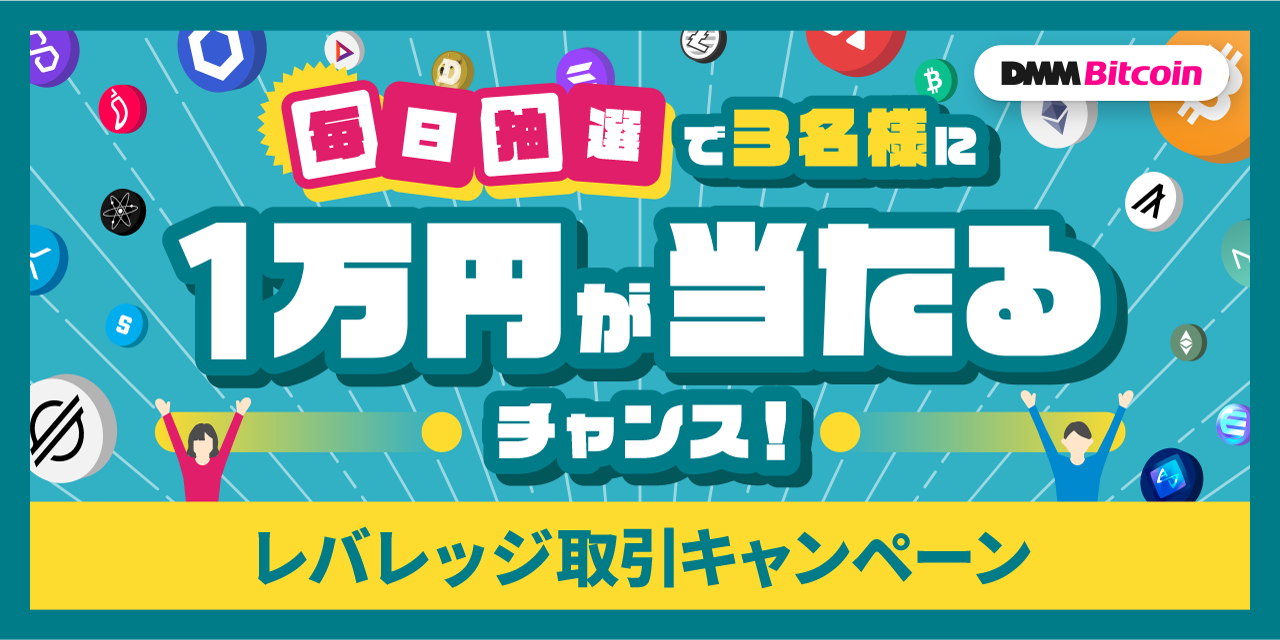 開催期間中に、レバレッジ取引にて1日に合計50,000円以上の暗号資産の新規注文(約定)をされたお客様の中から毎日抽選で3名様に10,000円をプレゼントいたします。