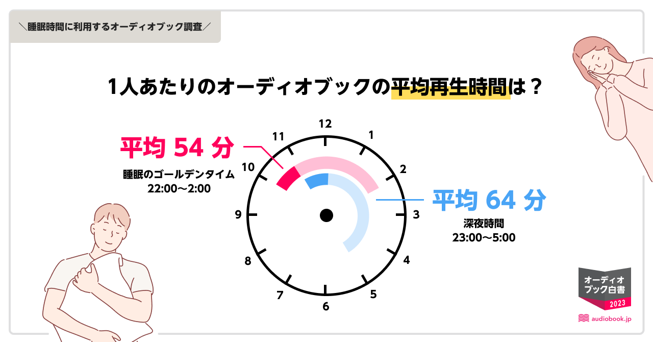 睡眠のゴールデンタイムと言われる22:00~2:00では平均54分間、深夜時間23:00~5:00では平均64分、オーディオブックが聴かれている