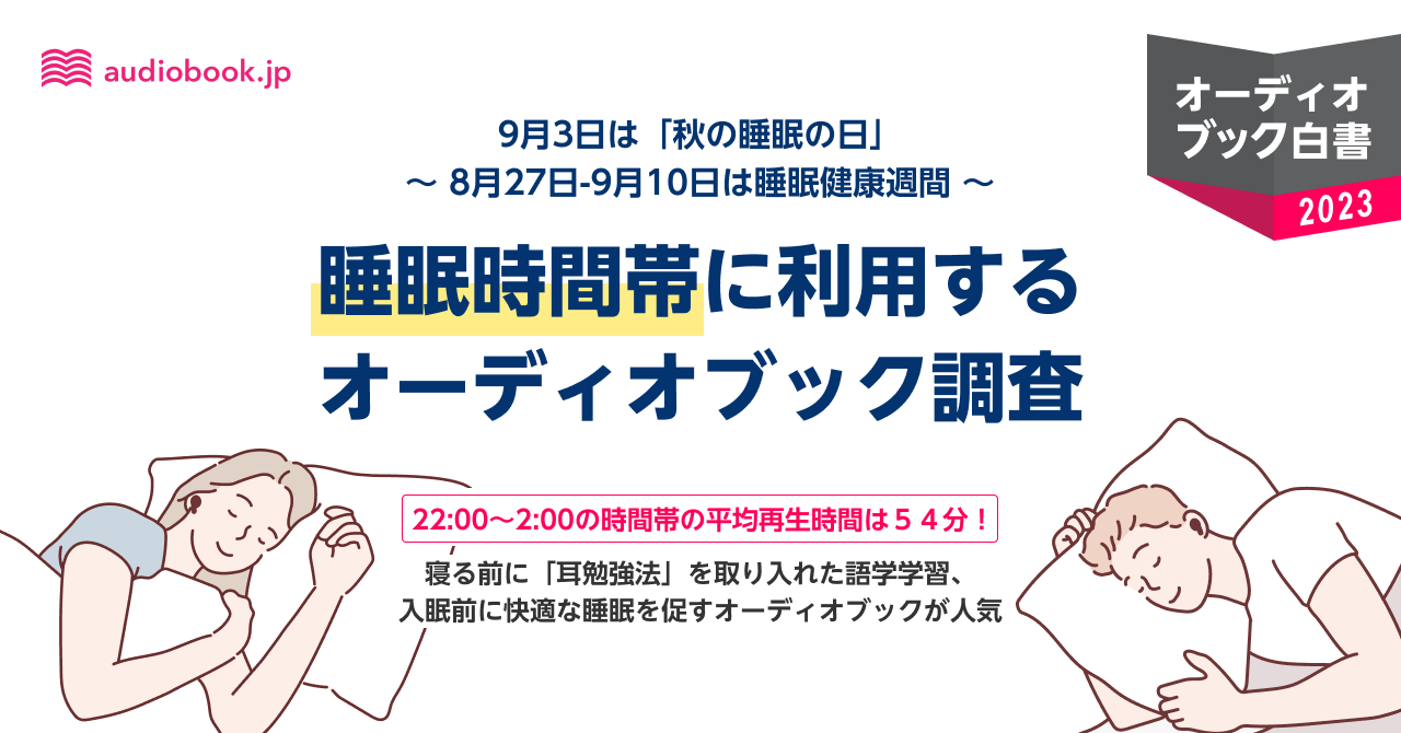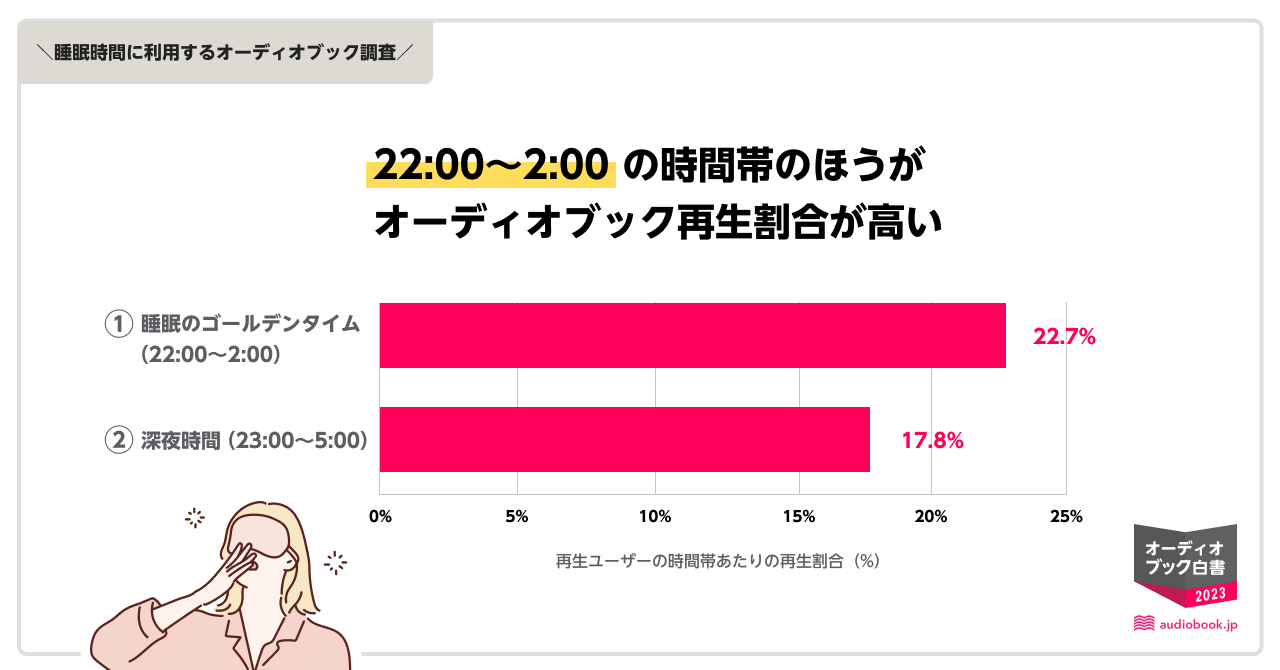 日本人の睡眠時間は世界に比べて低いという結果がでており、近年「スリープテック」が注目され良質な睡眠を科学的に解決する動きも活発となっています。本調査では、生活スタイルが多様化する中で、22:00~2:00を睡眠のゴールデンタイム、23:00~5:00を深夜時間と設定し、睡眠時間帯における「audiobook.jp」の利用傾向やよく聴かれている作品をご紹介いたします。