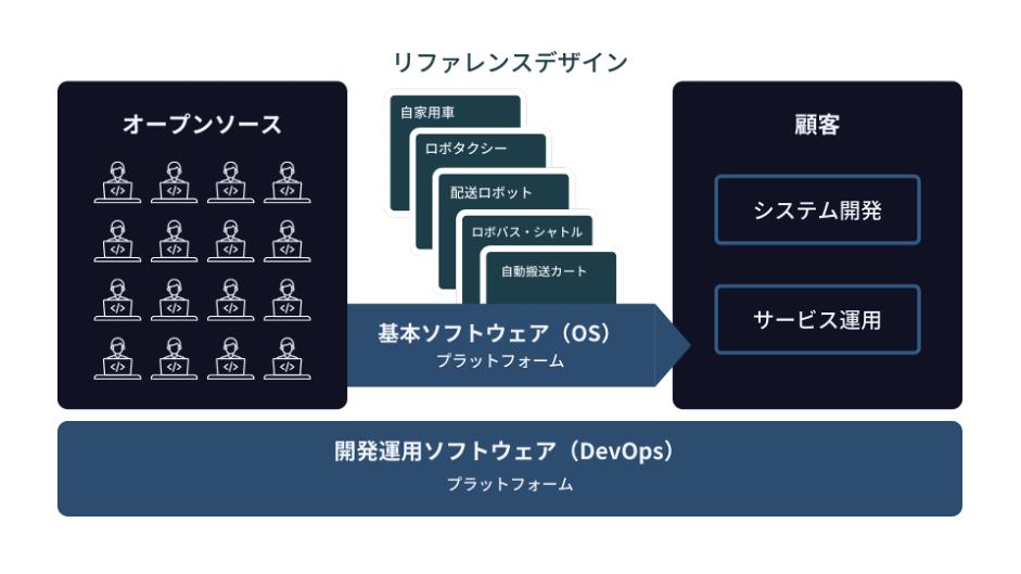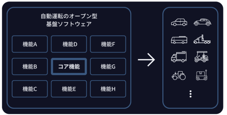 ティアフォーは、誰もが自動運転技術の発展に貢献できるエコシステムを実現すべく、「自動運転の民主化」をビジョンに掲げ、世界初となるオープンソースの自動運転ソフトウェア「Autoware」(注3)の開発を進めています。事業面では、労働力不足や交通弱者増加といった喫緊の社会課題と向き合い、その課題解決に資する共通プラットフォームの商用化を進める中で、主に施設内物流および限定地域交通分野の顧客(車両製造者および運行事業者)が参照できる自動運転システムの設計(リファレンスデザイン)を提供し、共通プラットフォーム上で各リファレンスデザインを必要に応じて拡張することで、顧客の要求に合った自動運転システムを、顧客とともに共同開発してまいりました(図2参照)。