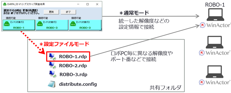 設定ファイルモードでは、指定したフォルダのrdpファイルを参照してリモートデスクトップ接続するため、これまでOnRPA経由のロボPCへの接続は全て同じ設定条件でしたが、ロボPC毎に異なる解像度やポート番号での接続が可能になります。また、同様に管理者によるOnRPAの設定情報の更新管理が可能となります。