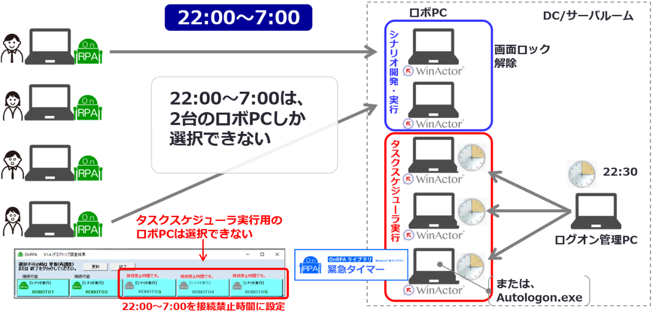 21:50 タスクスケジューラ用ロボPCを利用中のユーザにサインアウトメッセージを表示 22:00 タスクスケジューラ用ロボPCを再起動 22:00~7:00 接続禁止時間設定によりユーザはタスクスケジューラ用ロボPCを利用できない 22:30 ログオン管理PCからロボPCにリモート接続(ログオン) 23:00~6:00 タスクスケジューラによるシナリオ自動実行 |