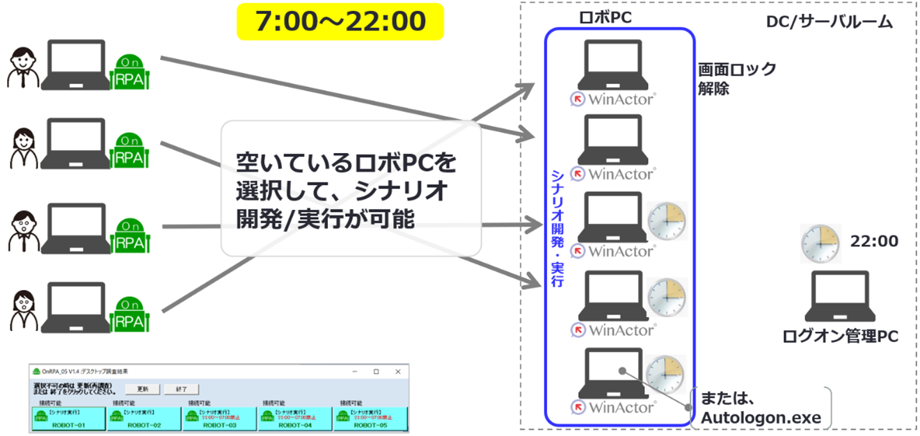 7:00~22:00 ユーザは全てのロボPCから空いているロボPCを選択して利用 |