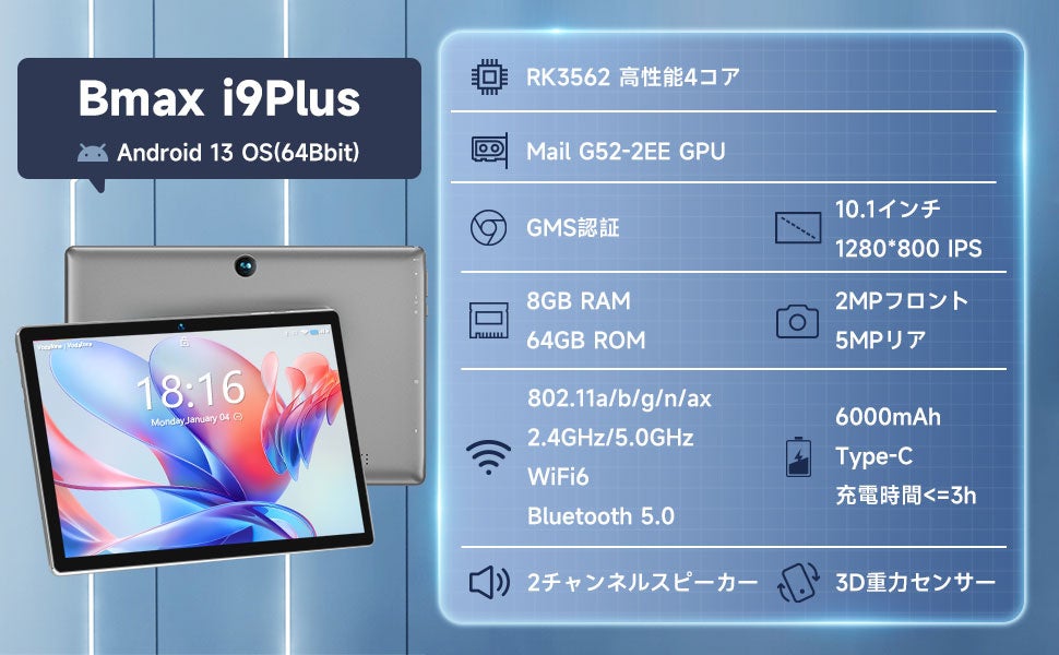 Bmax i9 Plus Android タブレットはRK3562高性能4コア2.0Ghz CPUが搭載なので、低消費電力と低発熱を実現でき、様々な機能が強化されており、より軽快な動作と高速な処理が可能になります。前世代と比較してパフォーマンスが127%向上しました。8GB RAMと64GB ROMの高速ストレージを搭載し、アプリを素早く起動させます。更に1TBまでメモリーの拡張ができ、容量を気にせずGoogle Playで 人気なアプリに対応でき、ビデオ、音楽、電子書籍、オンライン授業、ネットサーフィン、ゲームなど様々なエンターテイメントもこの一台で十分で、子供にも適当贈り物/子供用タブレットpcです。