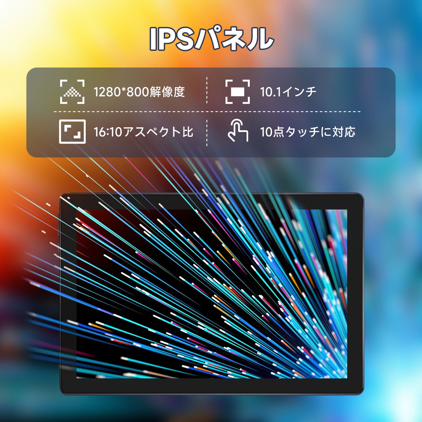 IPS ディスプレイを搭載したAndroid 13 タブレット 10インチ wi-fiモデル、1280*800の解像度を備えて、超広視野角を持ちます。16:10ゴールドスケールと合わせて、ドラマや映画の観賞にも、ゲーム体験にも非常に快適です。
