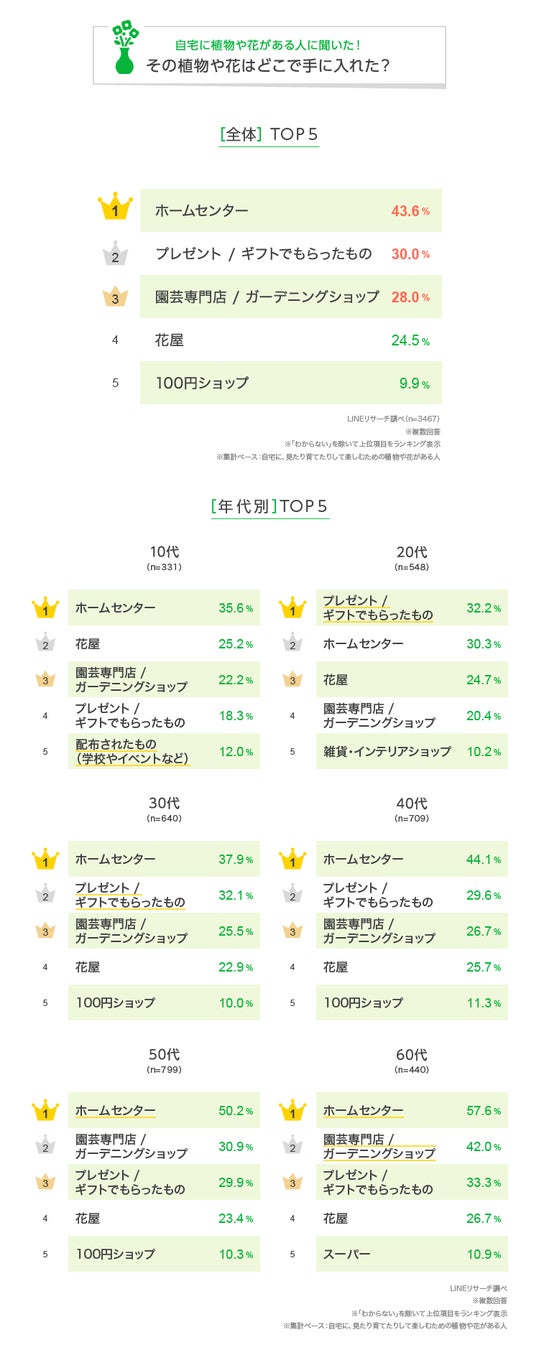 また、50~60代では「園芸専門店 / ガーデニングショップ」が2位にランクイン。自宅にある植物や花でも、「鉢植えの花」や「庭植えの花 / 花壇(プランター)」は50~60代の割合が高かったという結果もあり、ホームセンターや専門店に買いに行く様子がうかがえます。